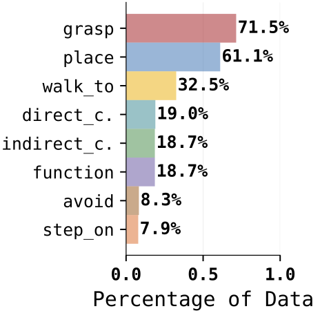- Task-level adaptation: The robot is asked to solve the task specified by a novel combination of affordance types (grasp, avoid, and indirect_contact), which is unseen during policy training.