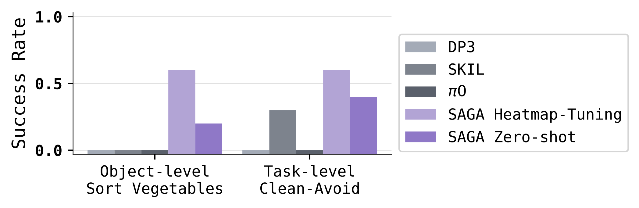 We evaluate SAGA for object-level and task-level adaptation using 10 demonstrations. Through heatmap-tuning, SAGA consistently outperforms baselines as well as the zero-shot model variant with heatmaps computed from ground truth instructions.